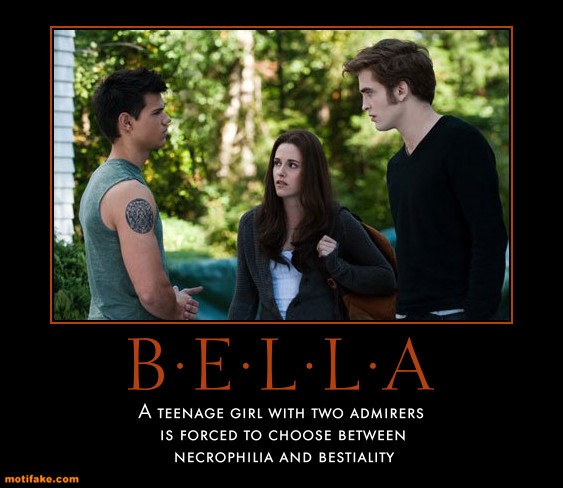 What Bella doesn’t realize is that the closer she gets to him, the further he backs away, because he can’t stand the smell of her..and it might be too late to try a new shampoo. Twilight is a love story about an ordinary girl who’s made up to be every girl’s idol, because she is plain, unattractive and STILL gets two guys fighting over her.